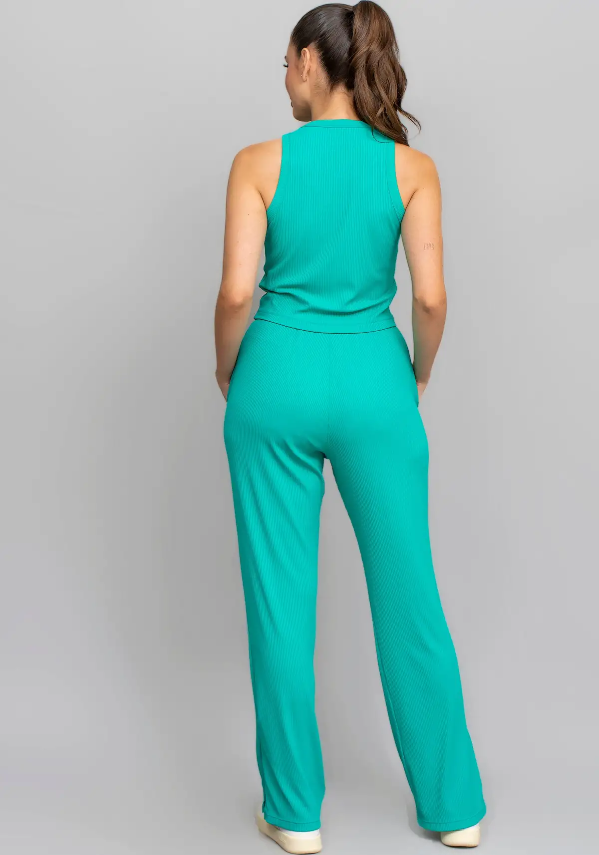 Modelagem cropped em formato regata, com textura canelada que alonga visualmente e traz acabamento limpo e moderno — perfeito para combinações minimalistas ou camadas.