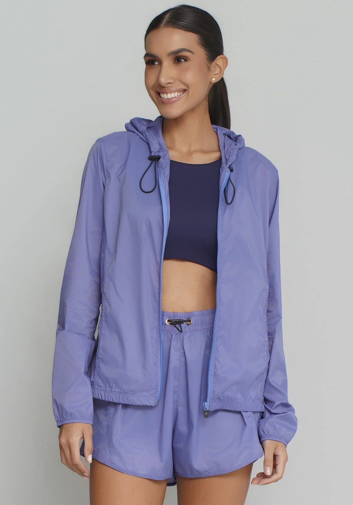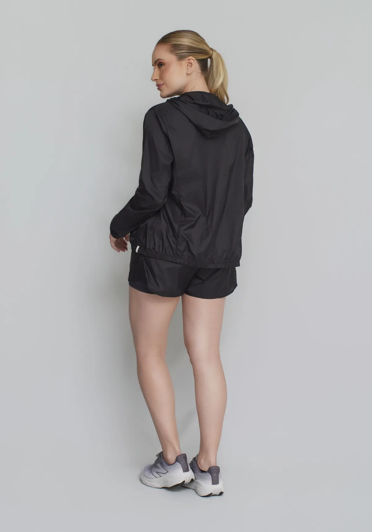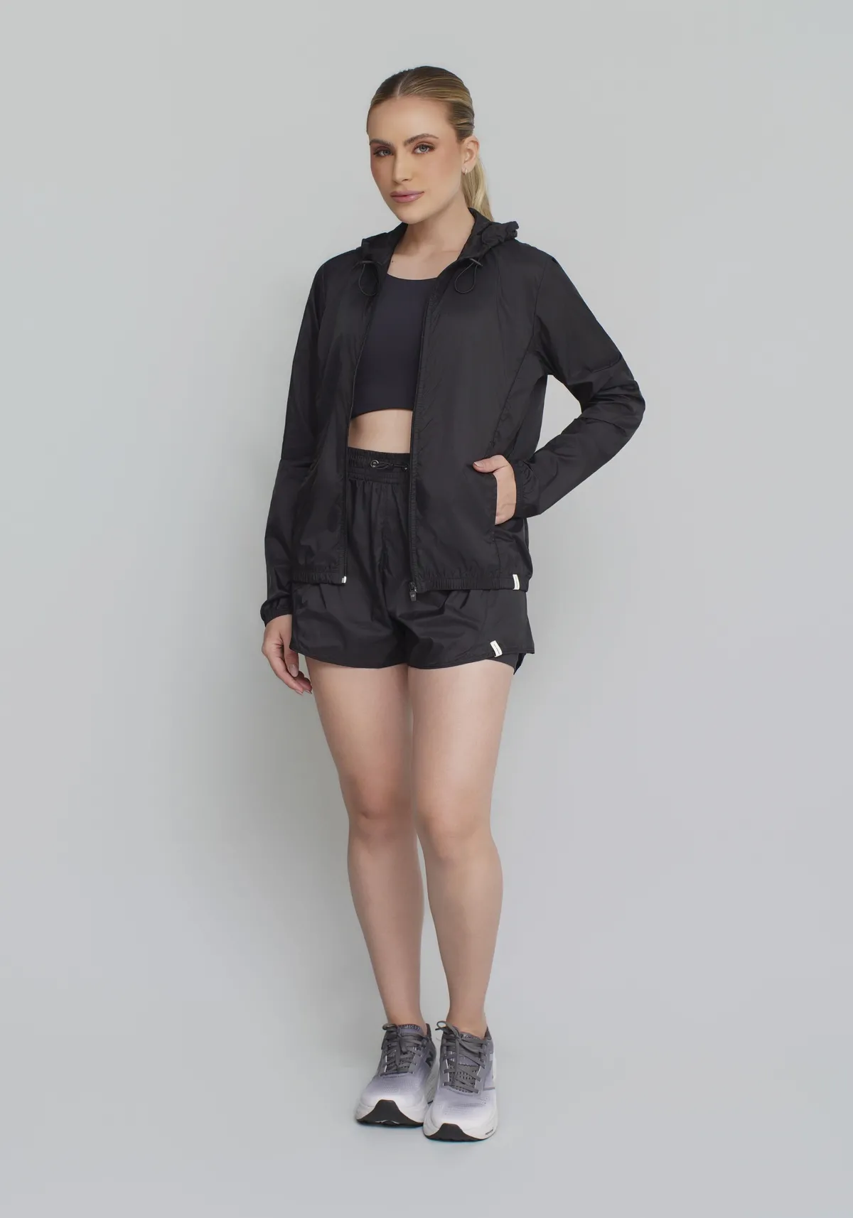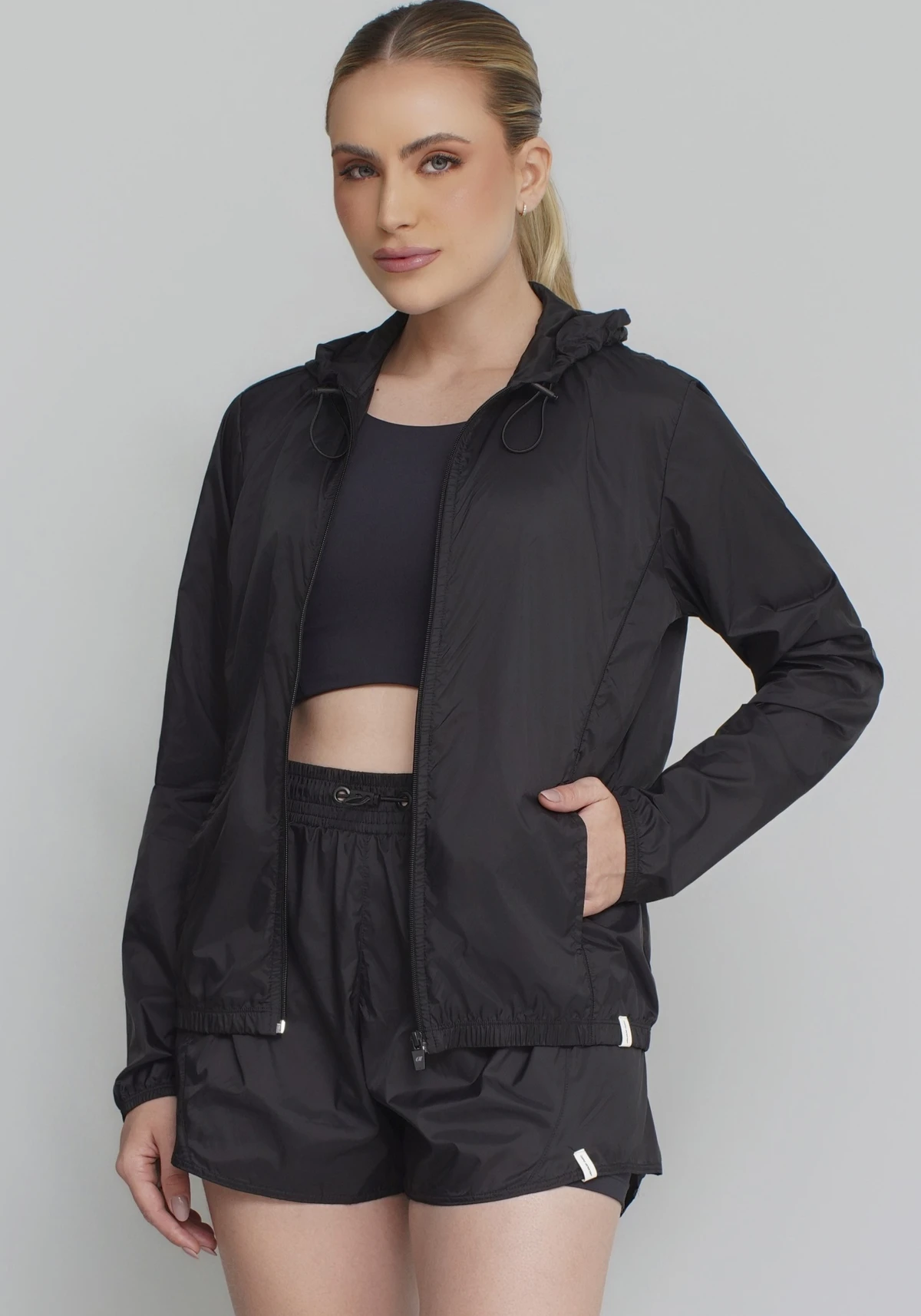 Modelagem esportiva com caimento leve, estilo clean e acabamento funcional, que permite sobrepor sobre tops, regatas ou t-shirts sem adicionar volume.