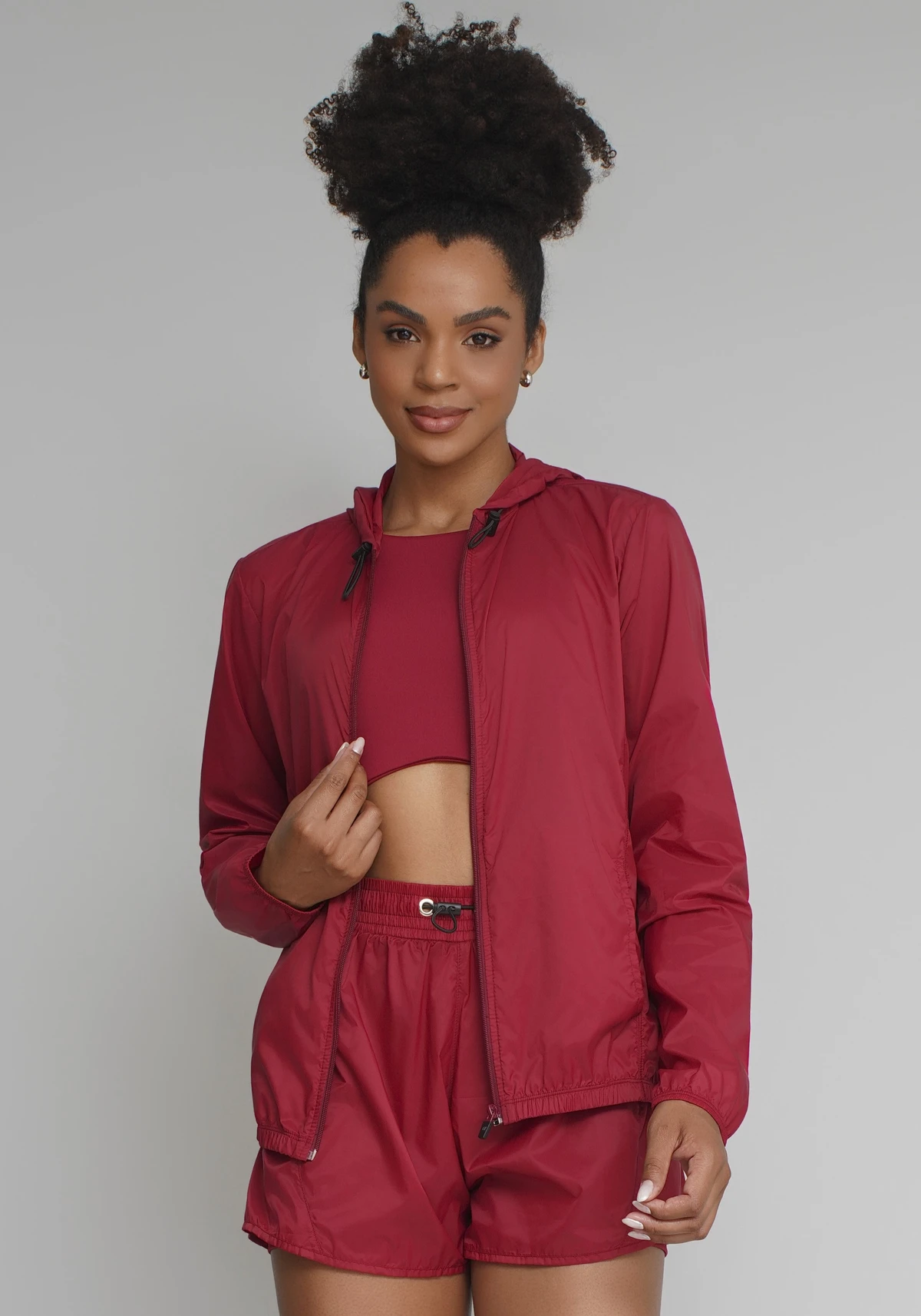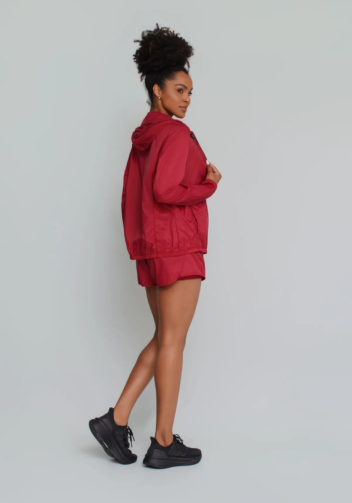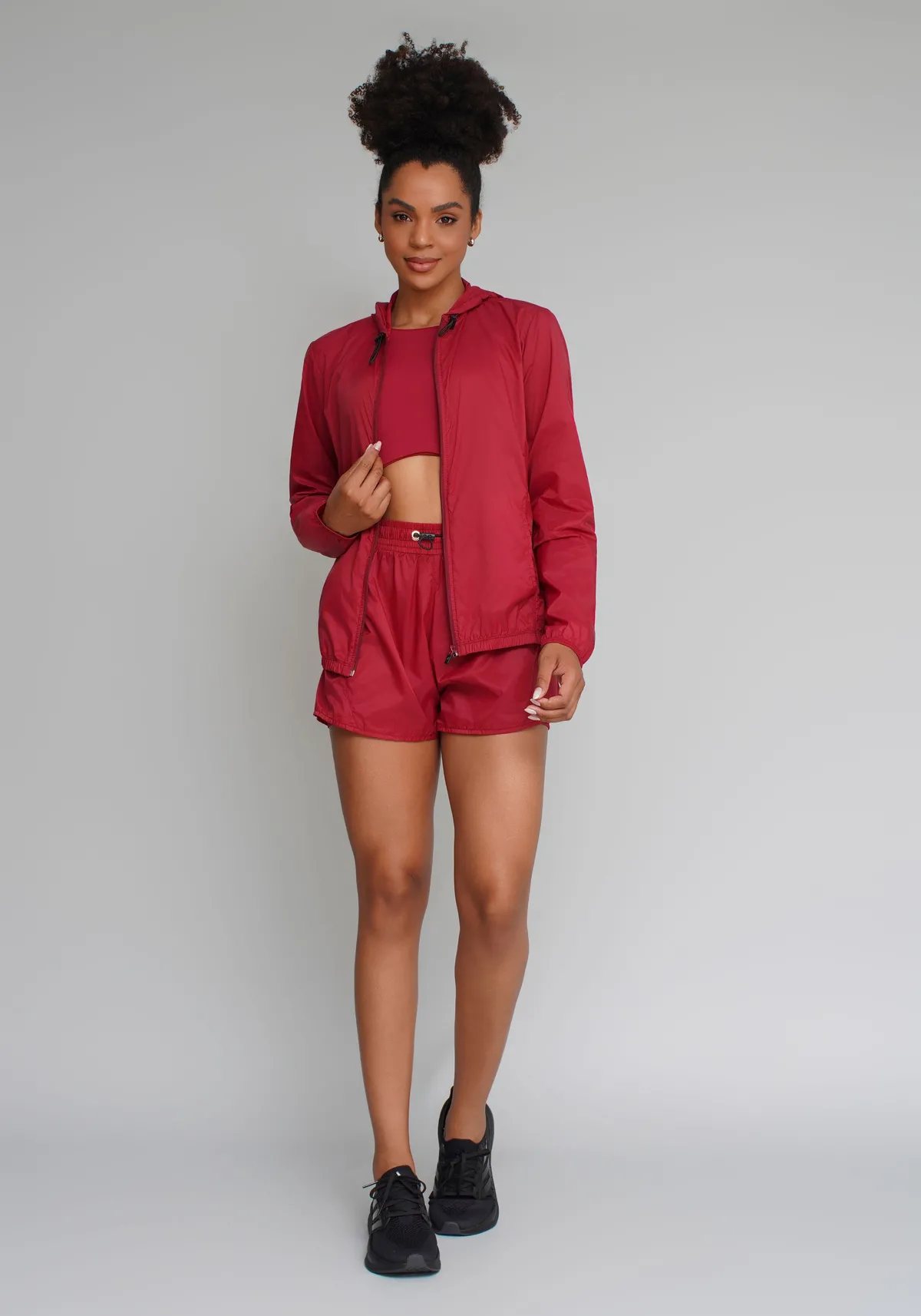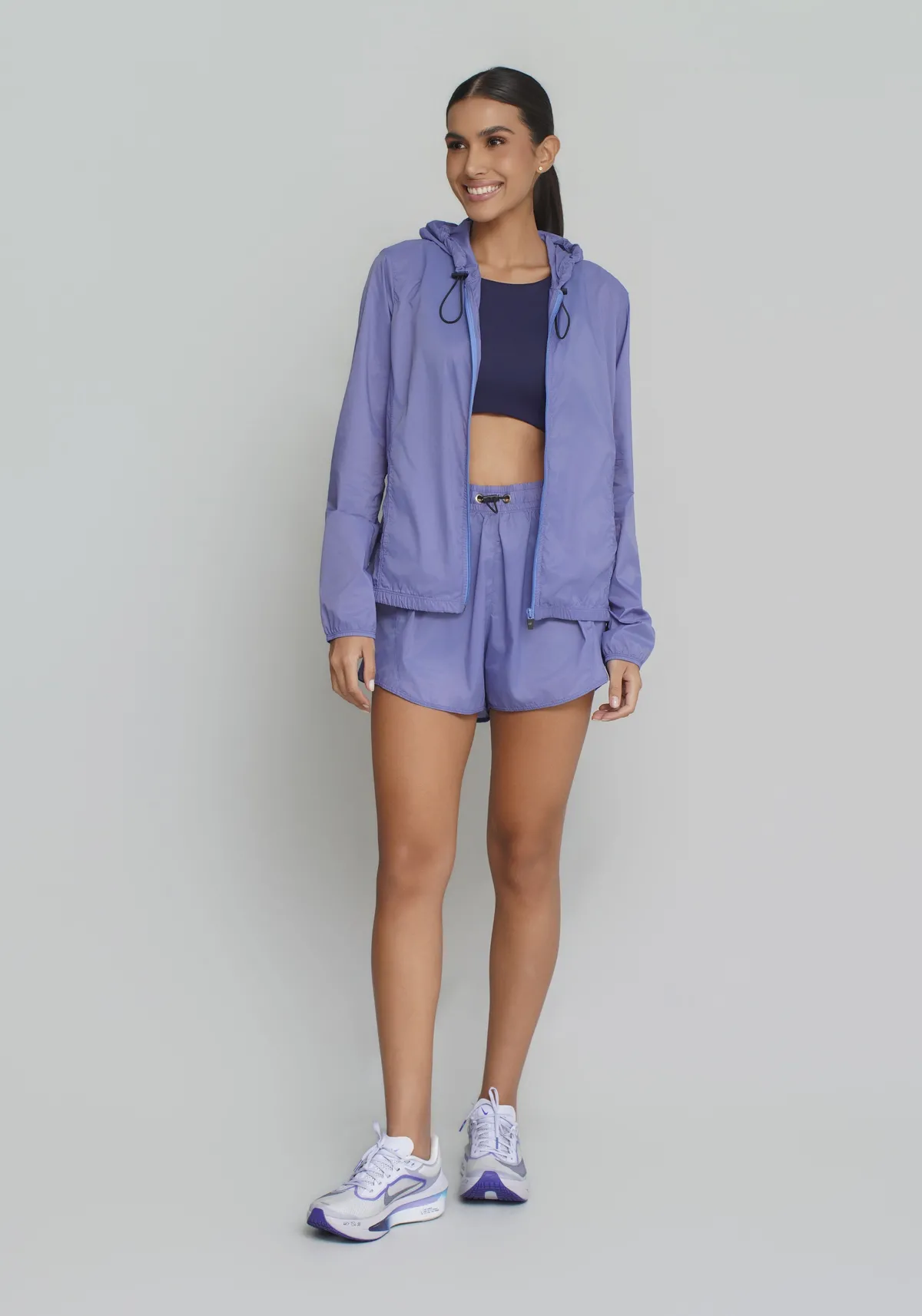 Modelagem esportiva com caimento leve, estilo clean e acabamento funcional, que permite sobrepor sobre tops, regatas ou t-shirts sem adicionar volume.