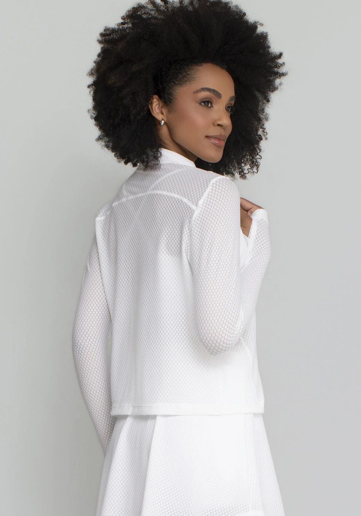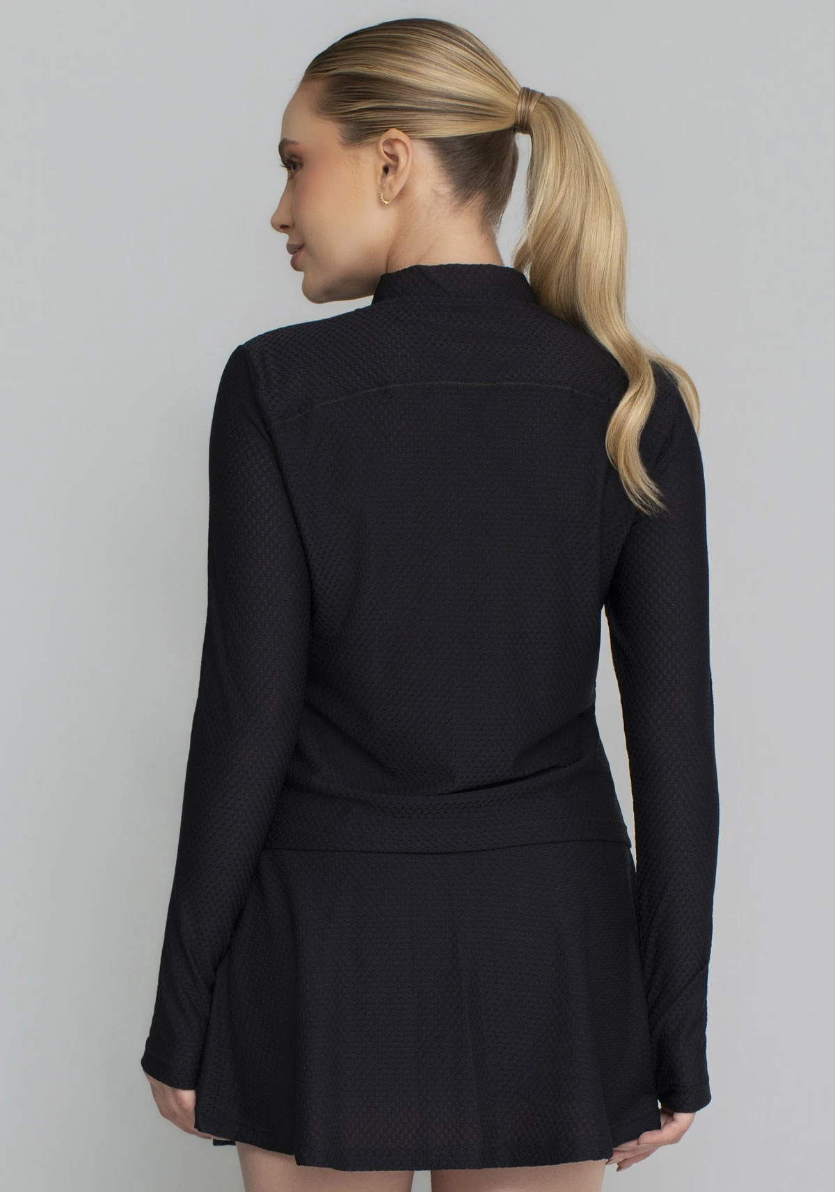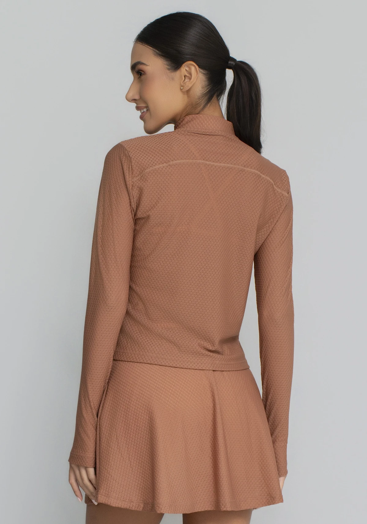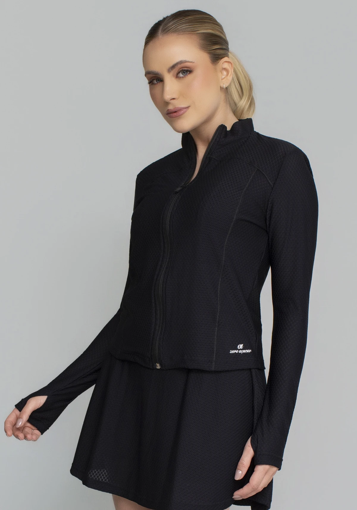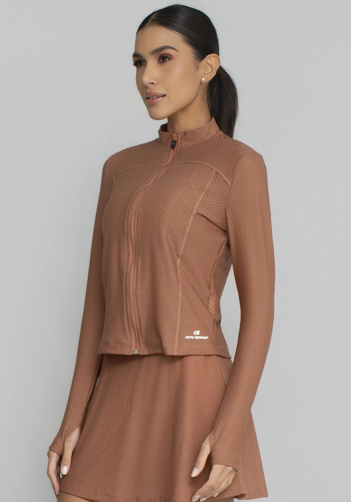 Uma peça versátil que une a ciência têxtil ao design geométrico, garantindo que você esteja protegida, seca e com estilo em qualquer ambiente.