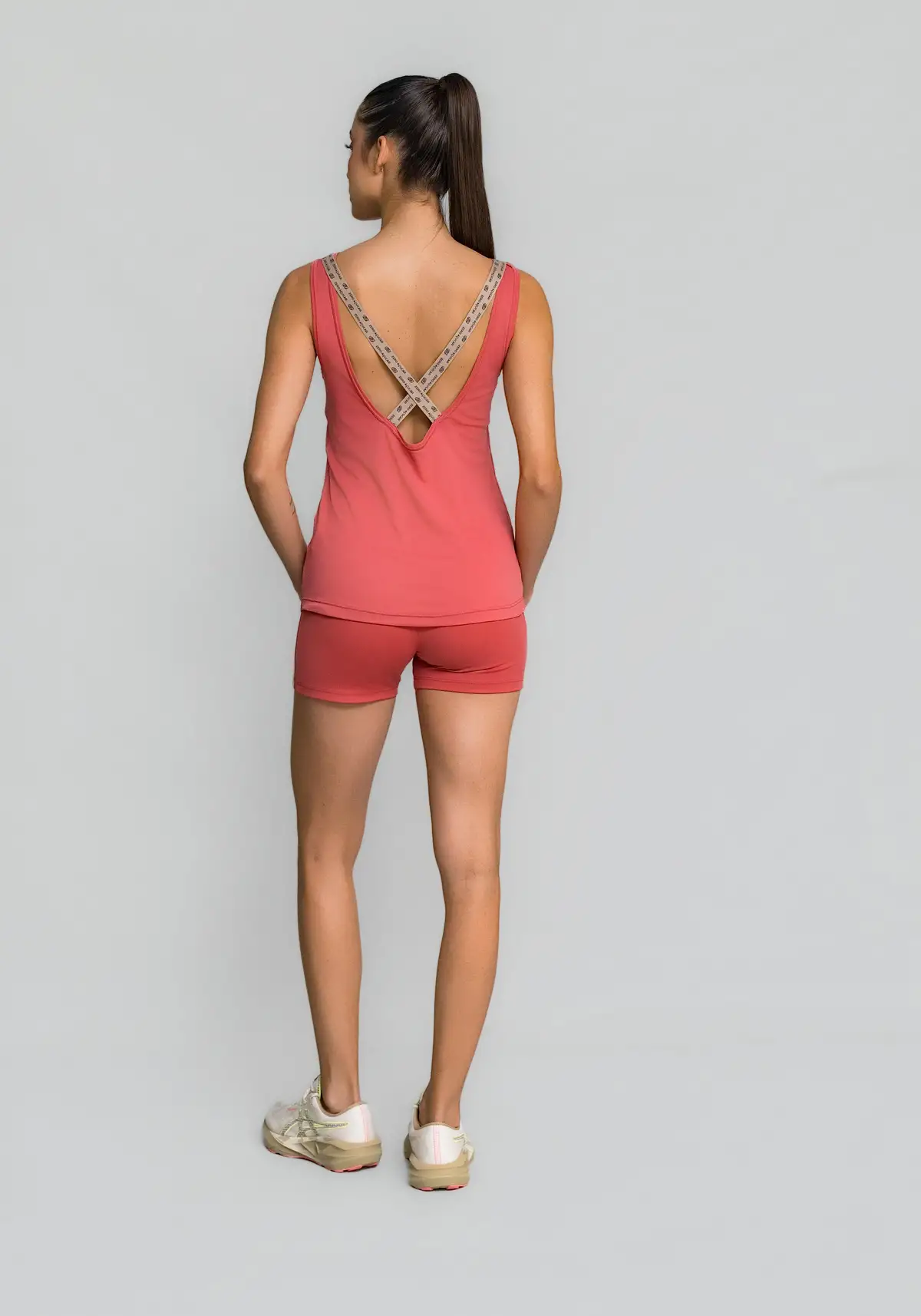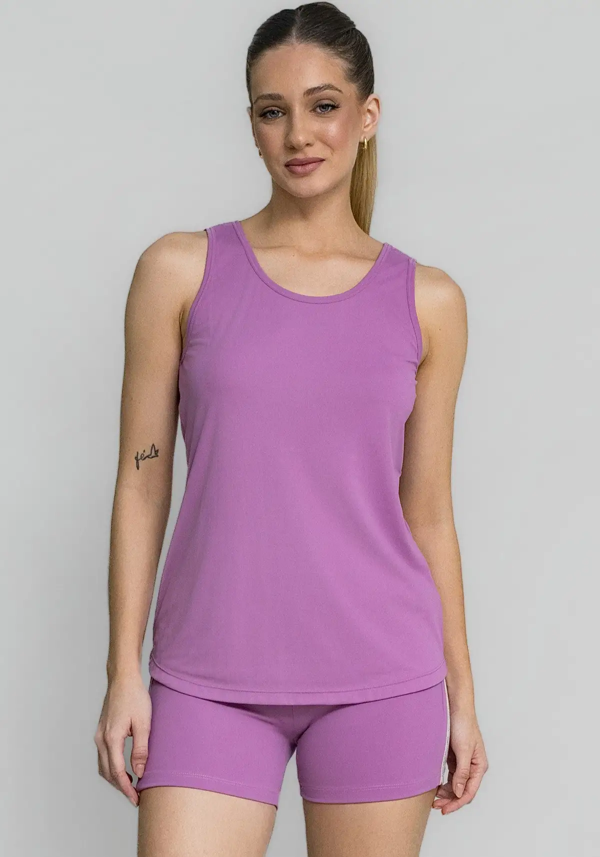 Modelagem ajustada com alças elásticas discretas que dão visual minimalista e esportivo. Versátil — funciona sozinha ou como base sob sobreposições.