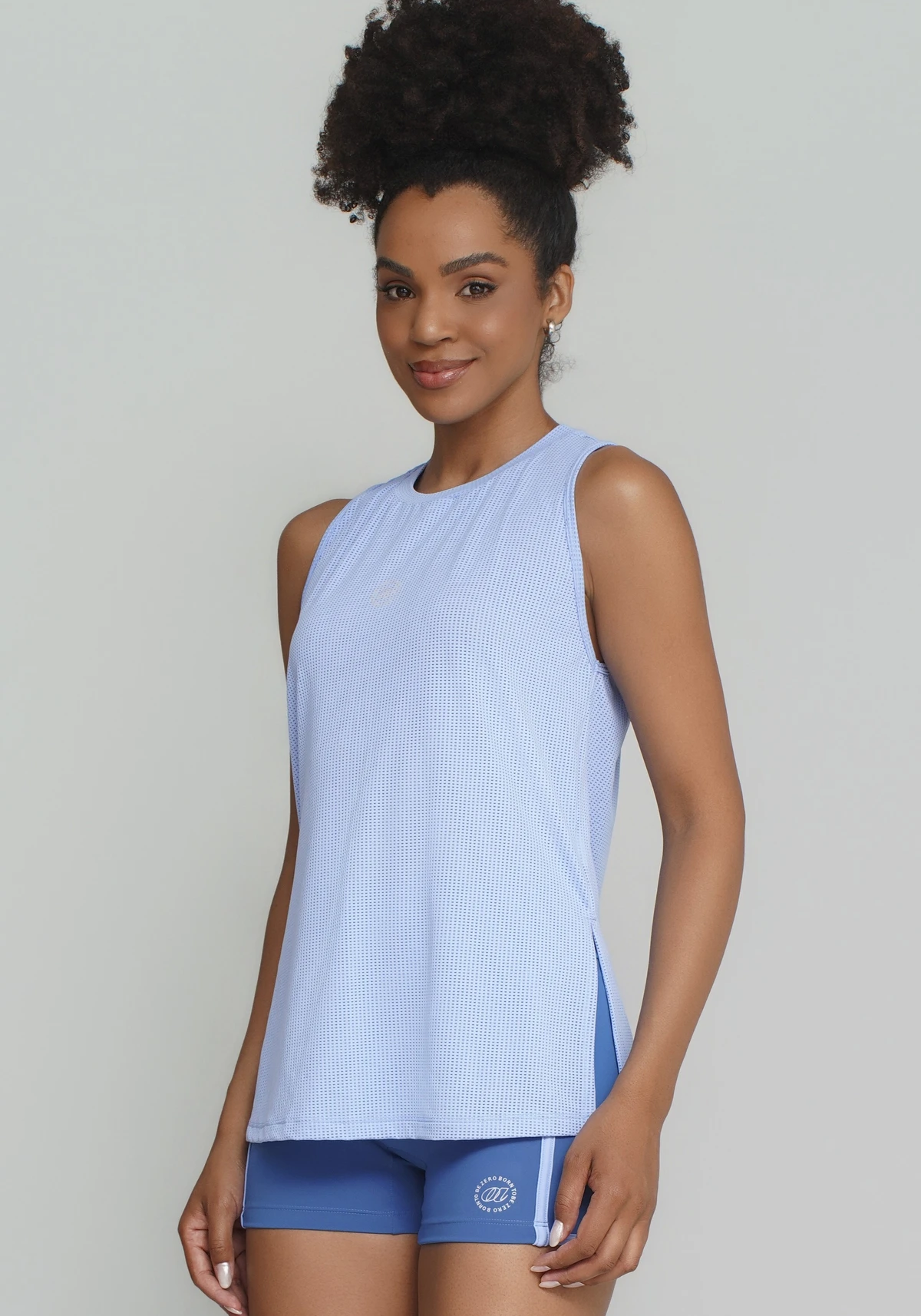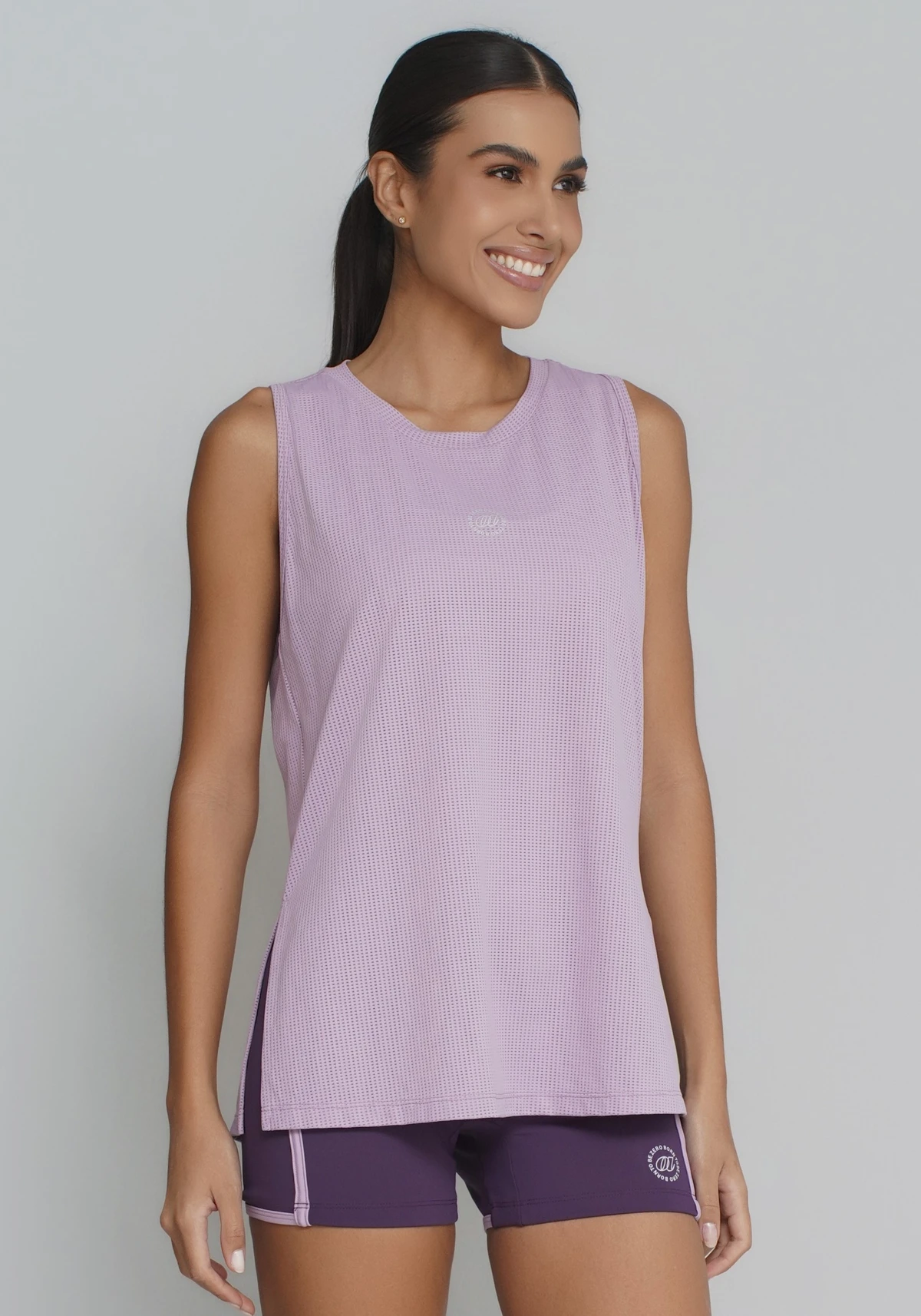 Modelagem moderna, com caimento solto e leve transparência elegante. Visual esportivo contemporâneo que valoriza a silhueta sem apertar.