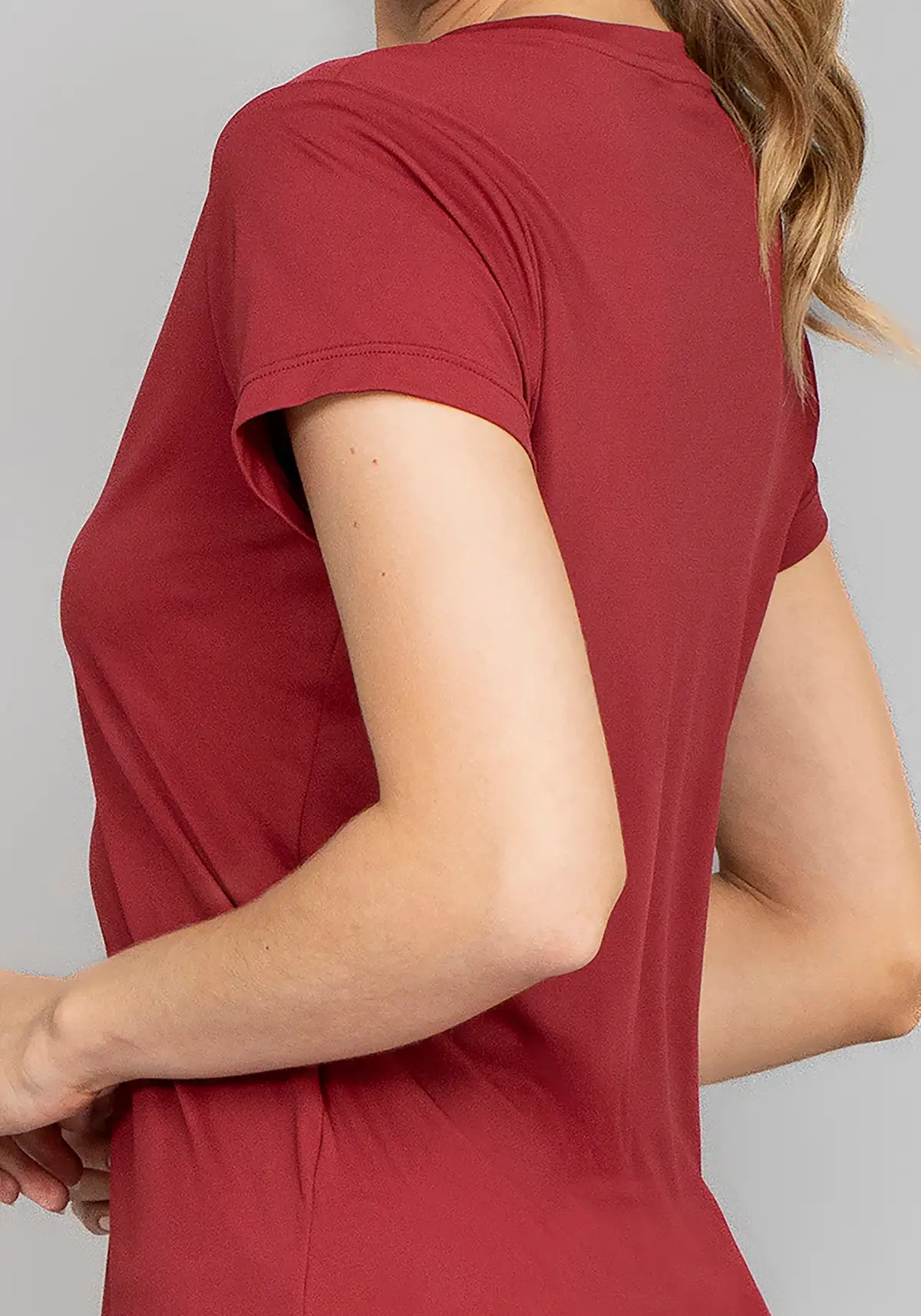 Modelagem com gola V moderna e feminina, caimento leve e fluido que valoriza o corpo sem marcar. Visual esportivo e versátil para dentro e fora da academia.