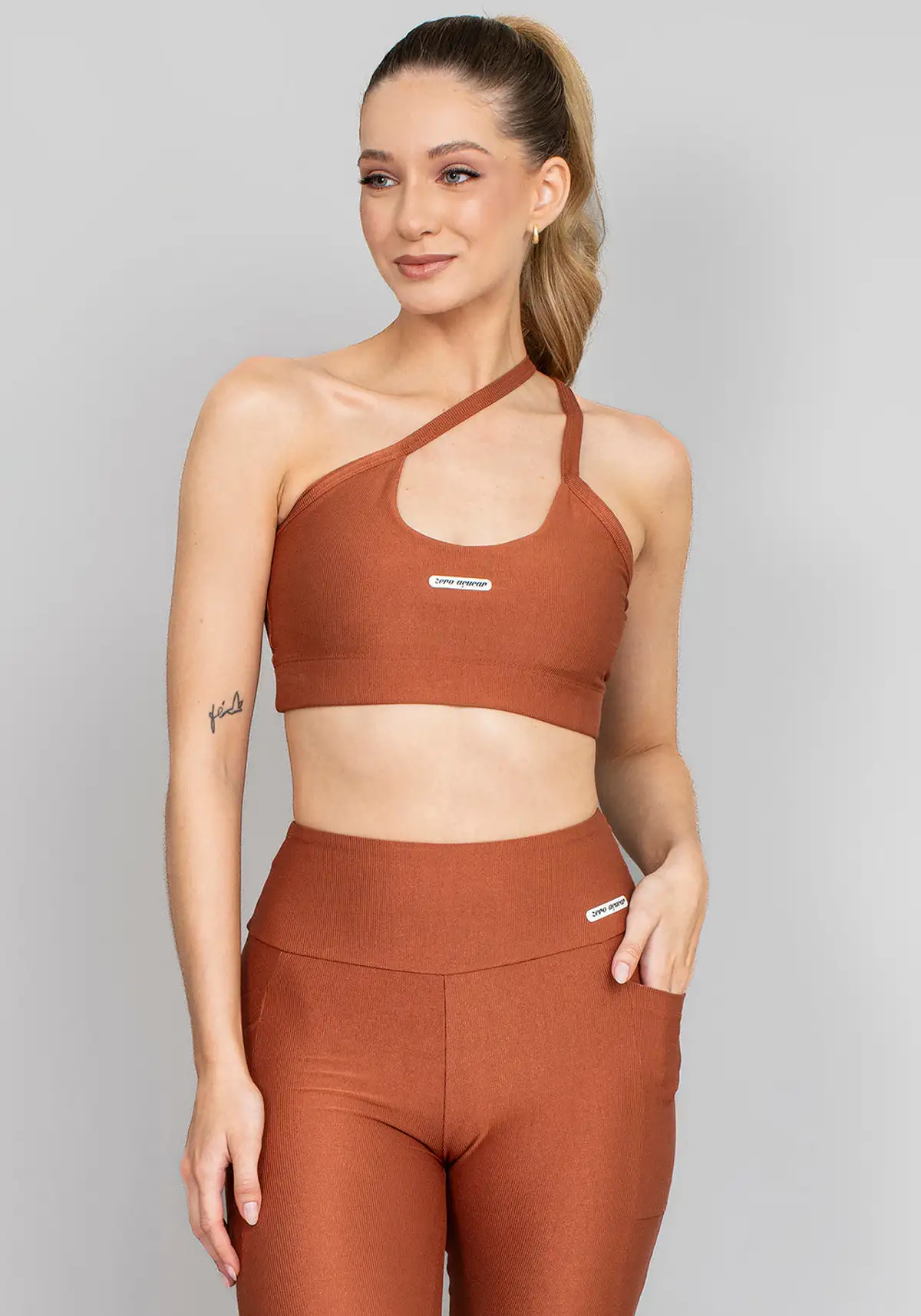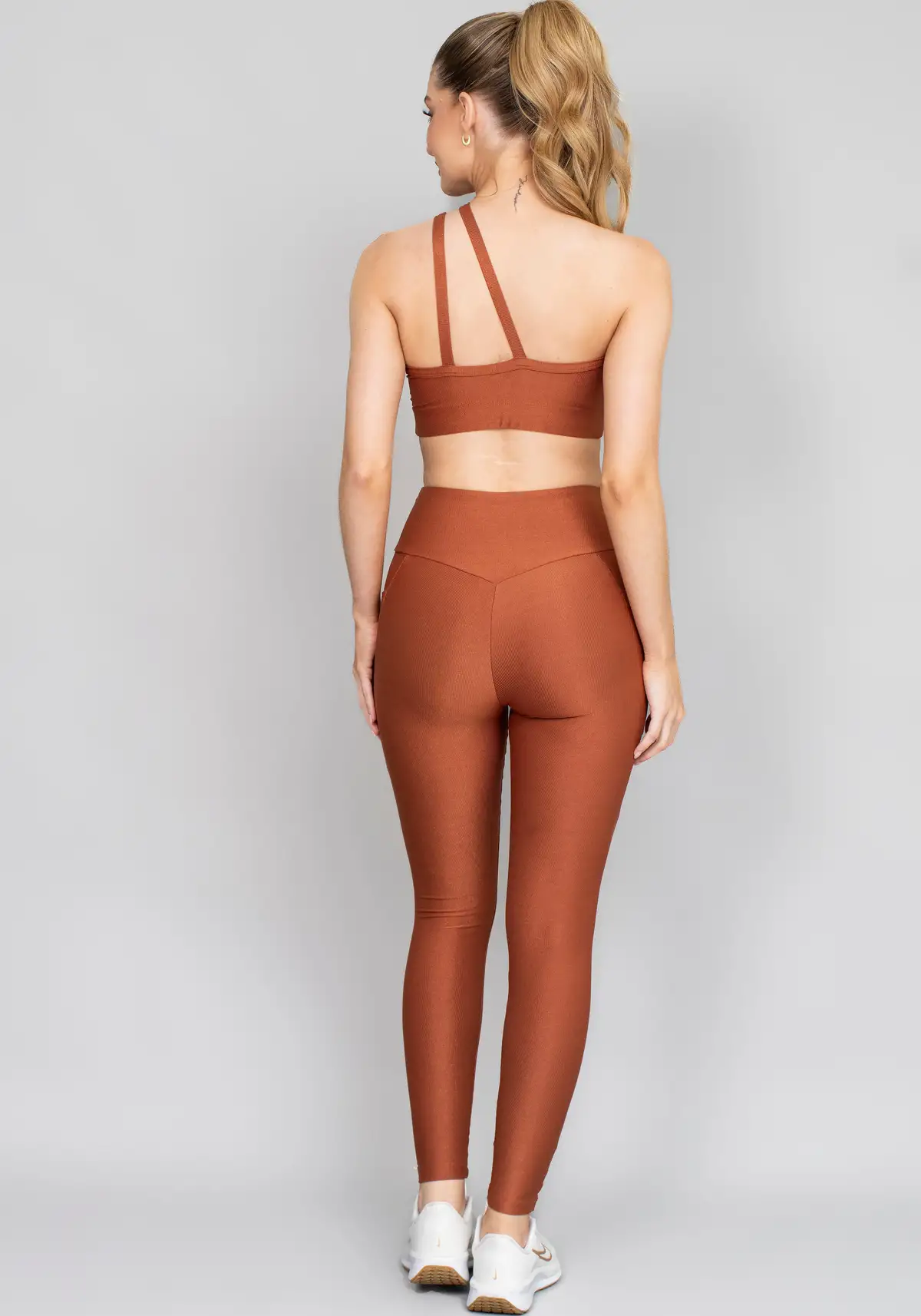 Tecido com leve brilho, toque macio e elasticidade equilibrada. Oferece secagem rápida, respirabilidade e resistência ao uso frequente sem perder o caimento.