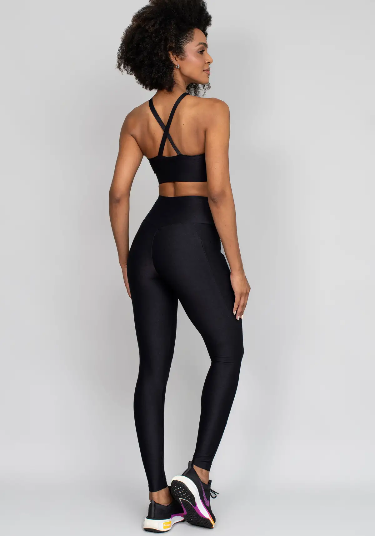 Combine com leggings de brilho sutil ou peças lisas para destacar o efeito luminoso do tecido. Funciona bem em looks de treino ou casuais esportivos.