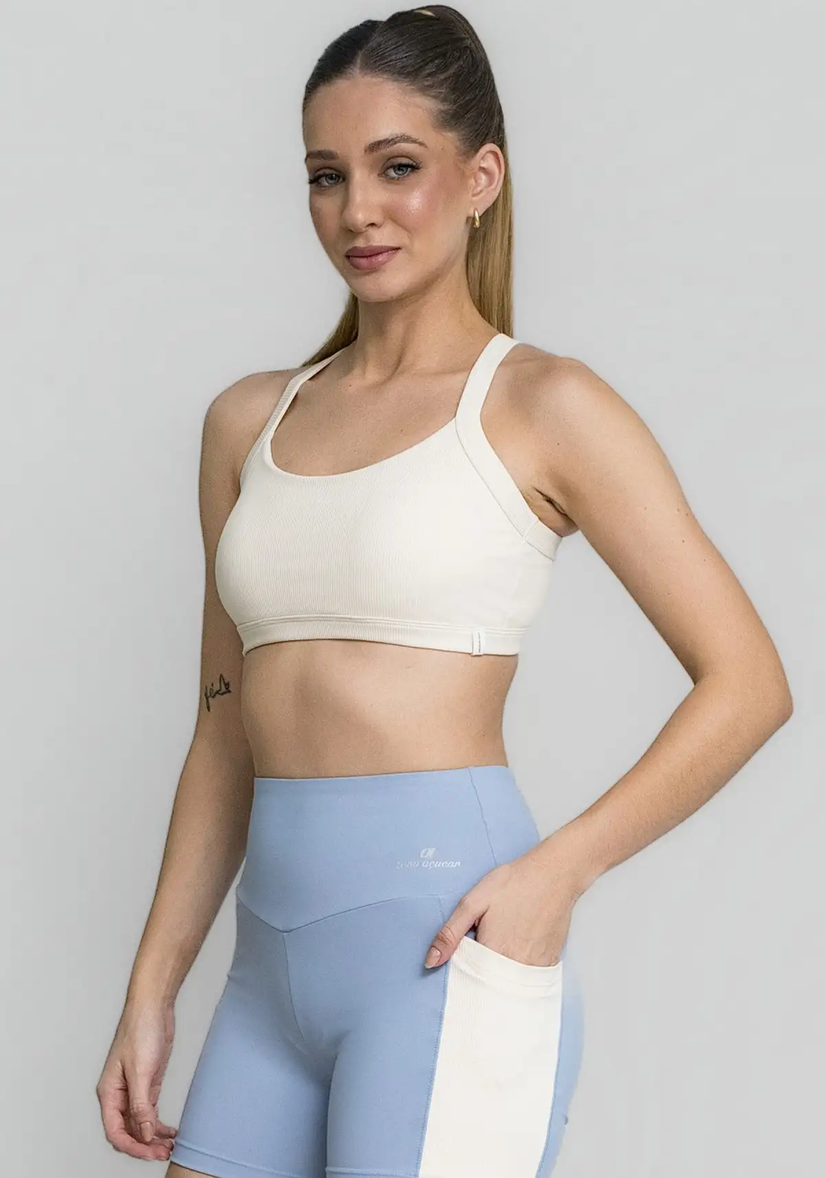 Tecido leve, com textura canelada que melhora a ventilação e proporciona toque suave. Elasticidade equilibrada e aparência sofisticada.