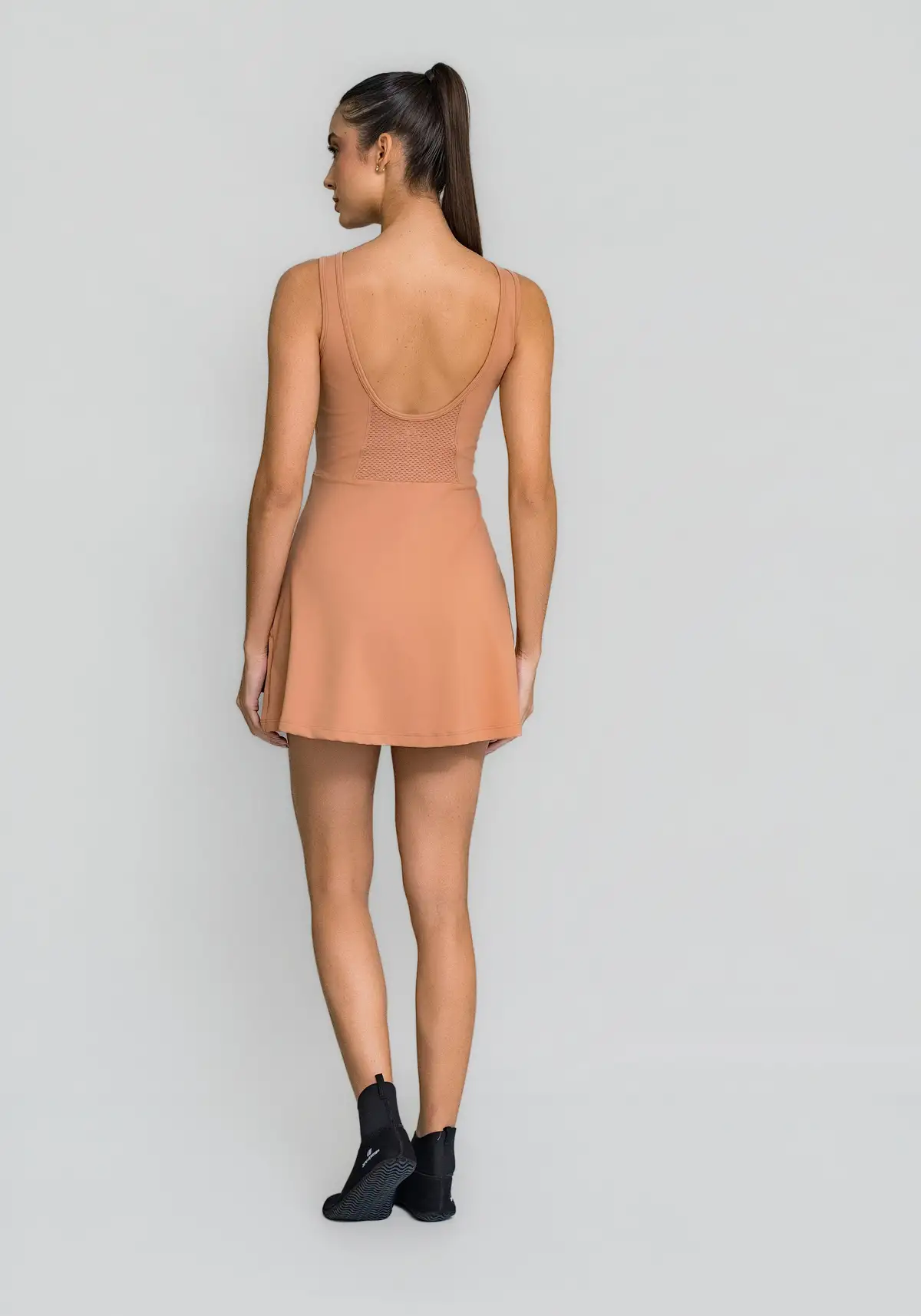 Tecido com secagem rápida, toque suave e elasticidade equilibrada. Proporciona liberdade de movimento com sensação leve no corpo e proteção solar para treinos externos.
